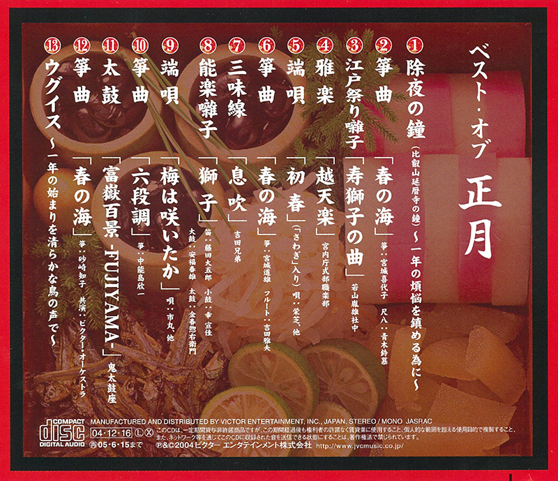 オープニングは音楽ではなく、「除夜の鐘」です。この音でまず1年間の煩悩を鎮めて下さい。次に流れるのは、正月の定番「春の海」。この「もろ正月」な調べは、あなたを一気に正月気分に誘います。その後は、江戸祭り囃子による威勢のいい「寿獅子の曲」、厳粛な雅楽「越天楽」、陽気な端唄「初春」などが次々に続きます。ふだん余り聴く事がない、和楽器による日本の調べ。サブスクで聴いているような、早口でまくし立てるボーカルも無ければ、せわしないビートもない。なんだかゆったりと安らぐ気持ちになっていきます。そして、これらを聴き進むうちに、貴方は、ある事に気づきます。それは、忘れかけていた「日本人の心」です。忙しい毎日の中で、いつのまにかどこかに置いてきてしまった「日本人のDNA」が呼び覚まされるのです。曲目の最後には「ウグイスの鳴き声」が収録されています。安らいだ気持ちになった後には、清らかな鳥の声を聴きながら、新しい年に想いを馳せてください。きっと「いろいろあるけど、今年もまた頑張ろう」というポジティブな気持ちになれるはずです。